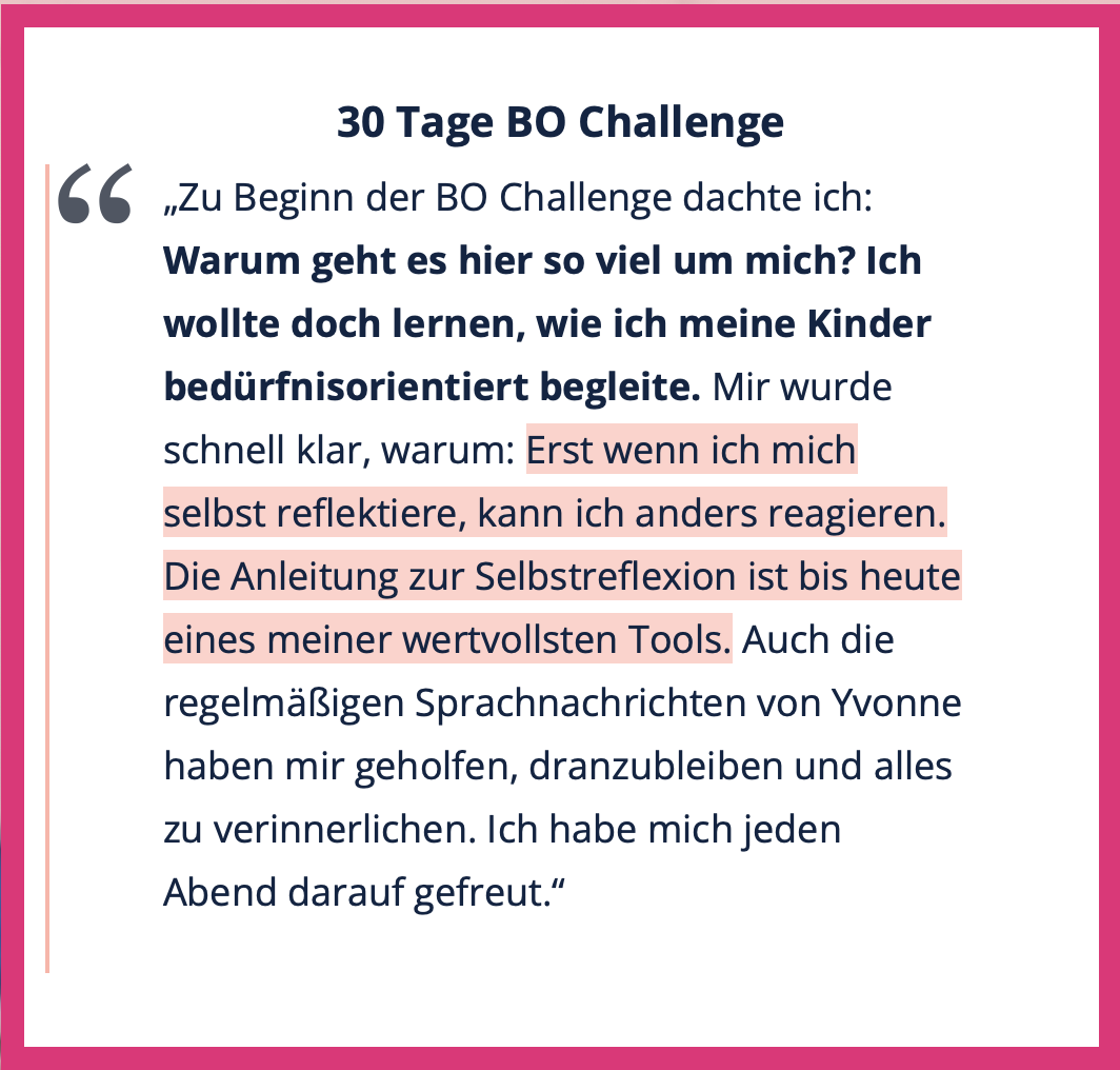 „Zu Beginn der BO Challenge dachte ich: Warum geht es hier so viel um mich? Ich wollte doch lernen, wie ich meine Kinder bedürfnisorientiert begleite. Mir wurde schnell klar, warum: Erst wenn ich mich selbst reflektiere, kann ich anders reagieren. Die Anleitung zur Selbstreflexion ist bis heute eines meiner wertvollsten Tools. Auch die regelmäßigen Sprachnachrichten von Yvonne haben mir geholfen, dranzubleiben und alles zu verinnerlichen. Ich habe mich jeden Abend darauf gefreut.“